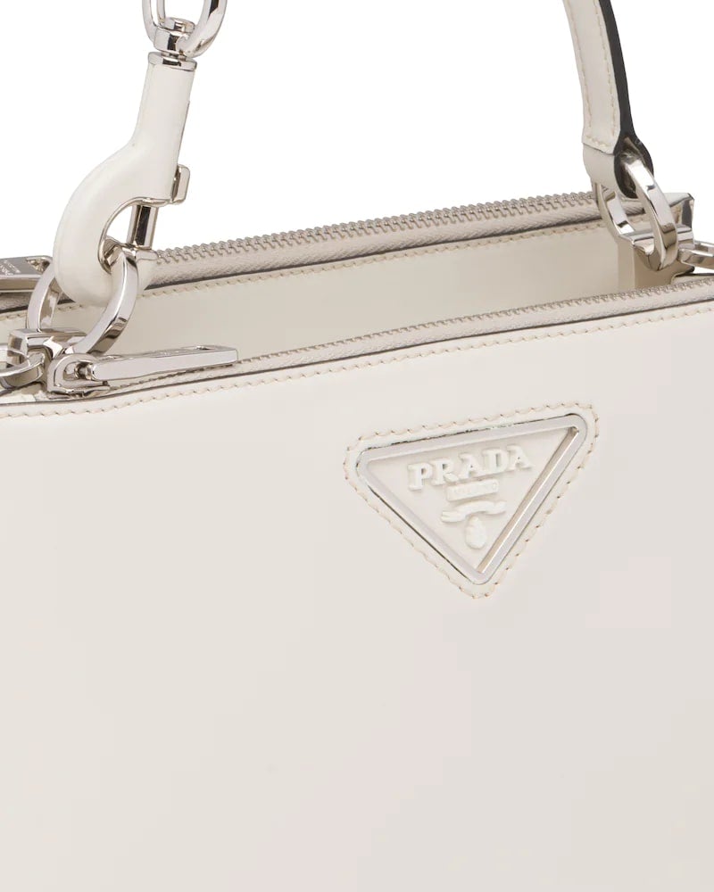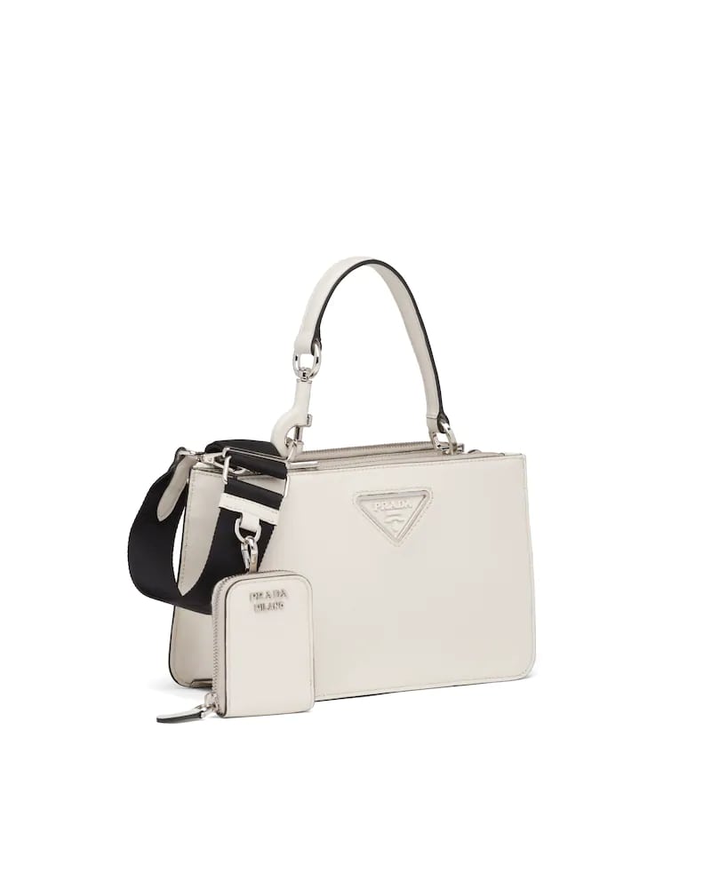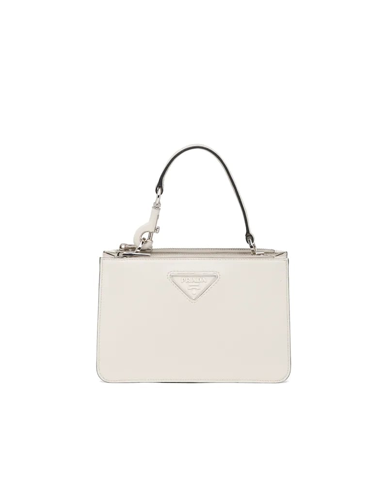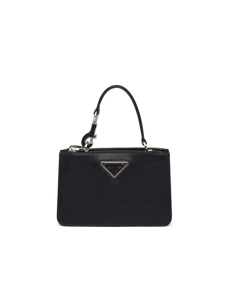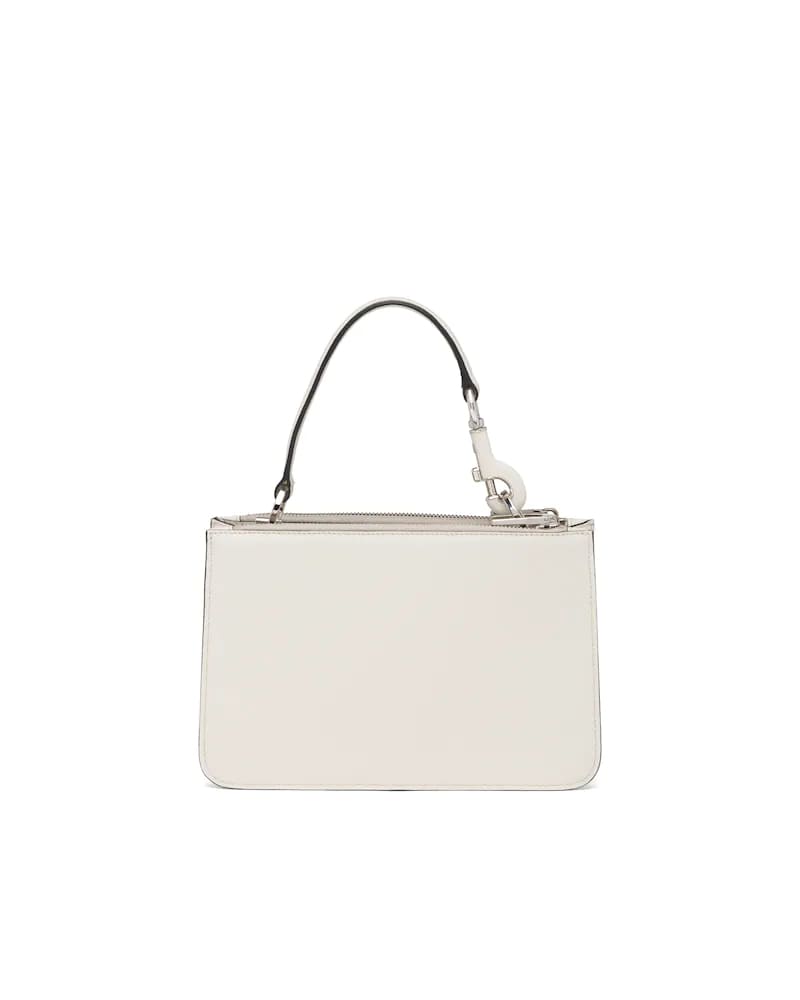 This handbag is characterized by its contemporary, multifunctional look, its sleek and structured line and the small pouch that attaches to the removable shoulder strap. The soft leather accessory features the varnished metal lettering logo on the front.