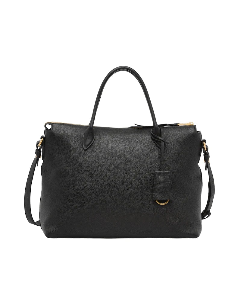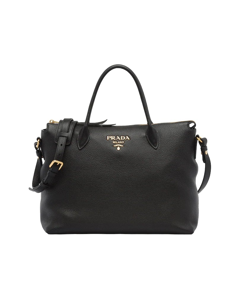 This leather bag with double shoulder strap is decorated with the Prada metal logo.