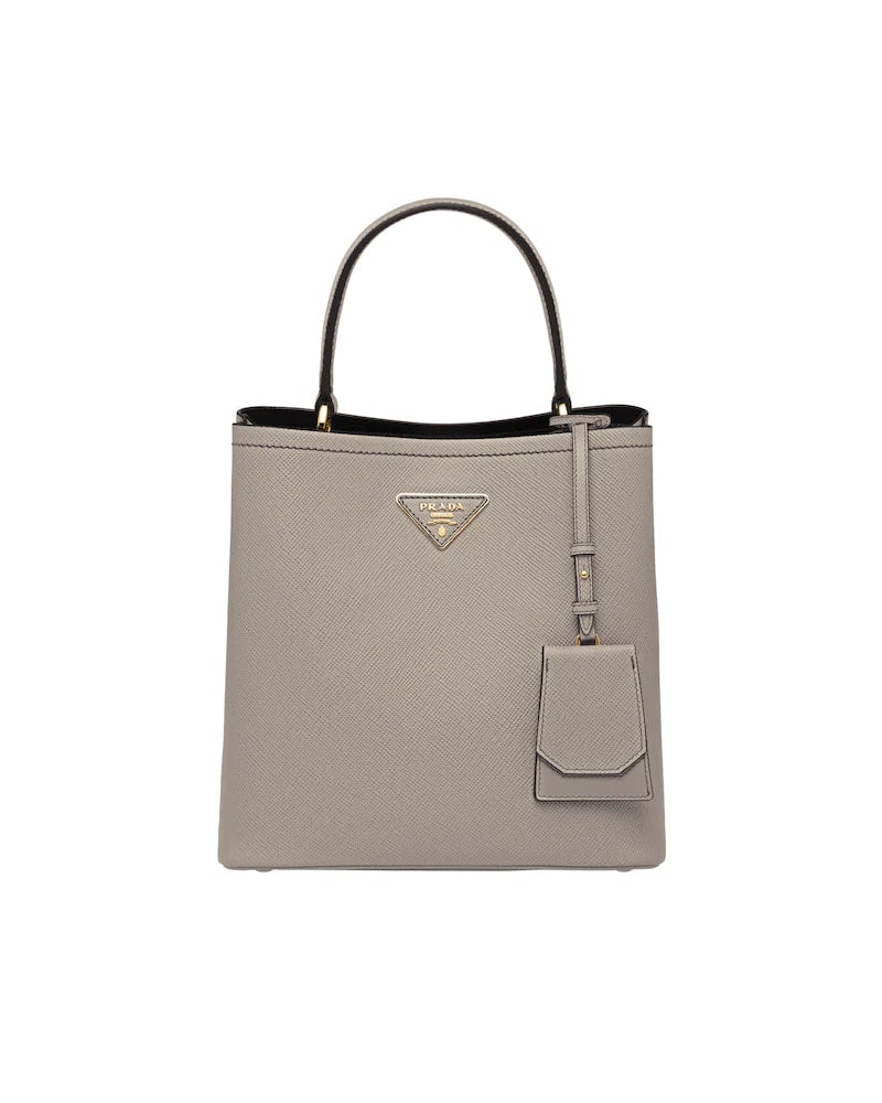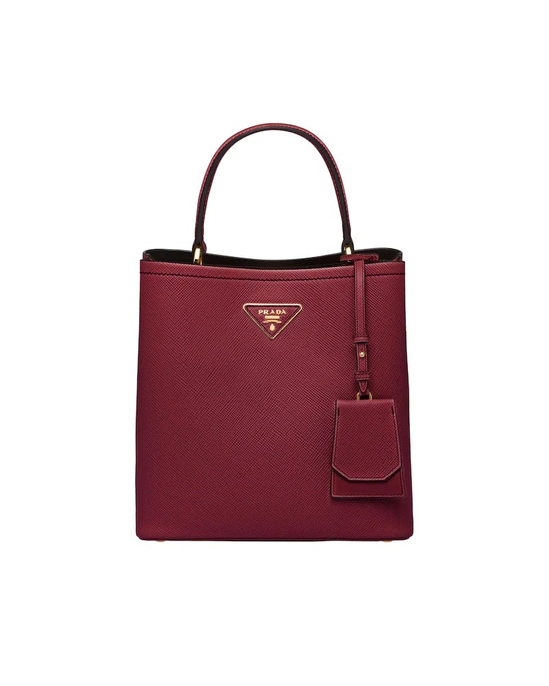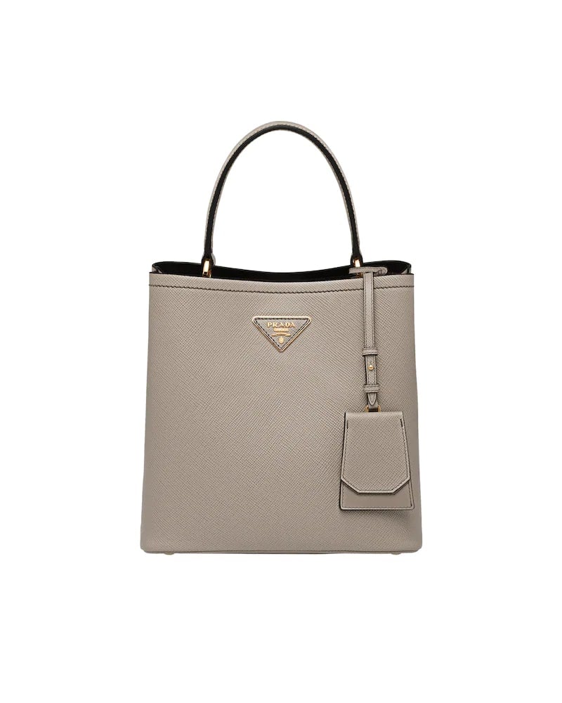 The elegant design of the Prada Panier bag is emphasized by the unmistakable texture of Saffiano leather. The bag has a detachable shoulder strap and an exclusive leather name tag with metal logo.