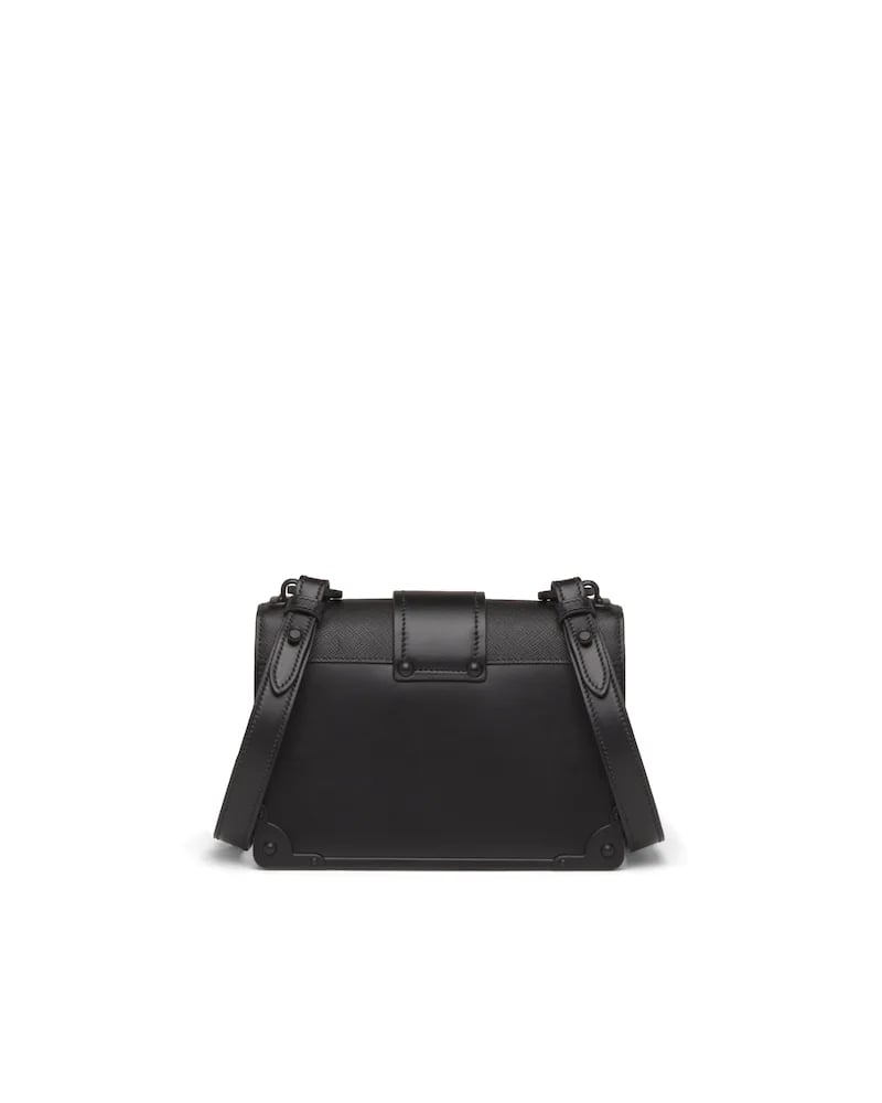 The Prada Cahier bag, created to protect and safeguard its contents, is decorated with metal details. The accessory has a shoulder strap.