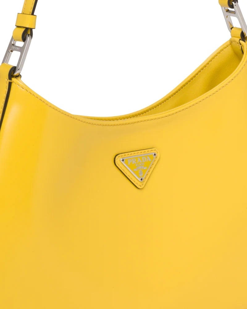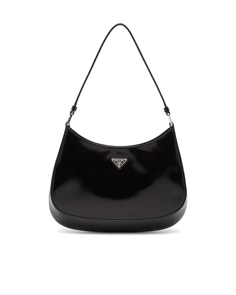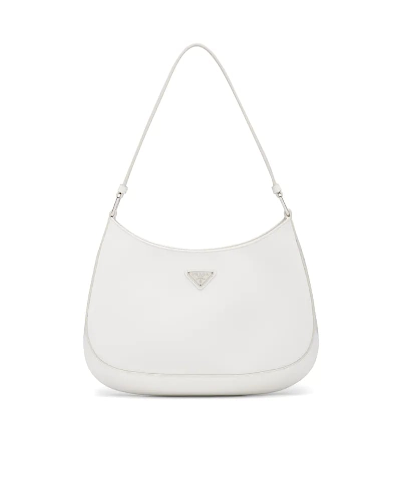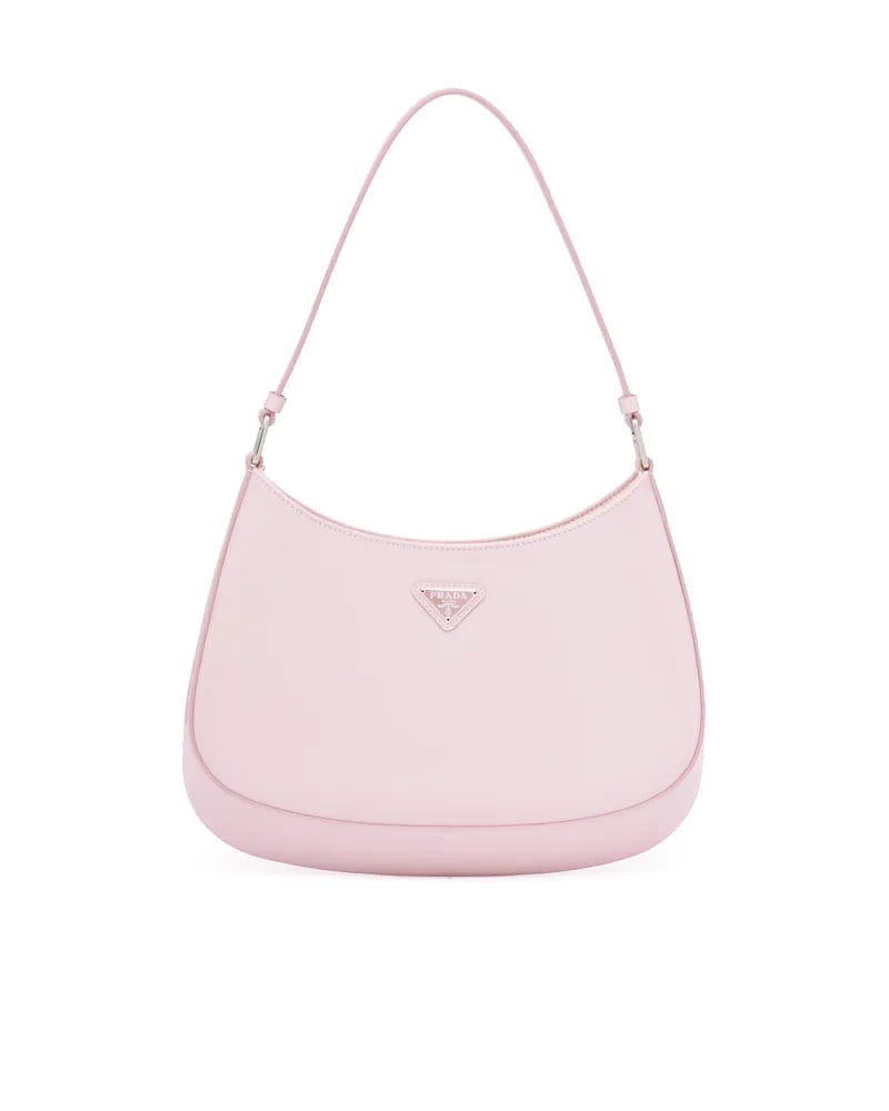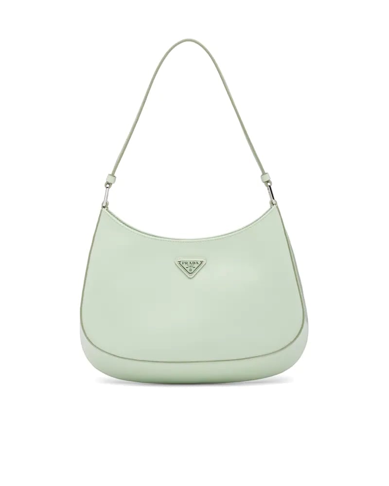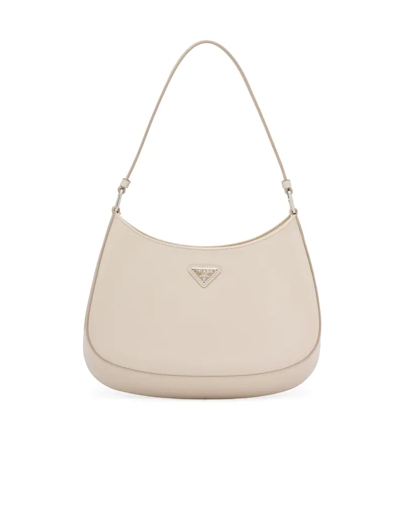 The Prada Cleo bag with sophisticated allure reinterprets an iconic design of the brand from the 1990's. Sleek curved lines emphasized by the particular construction rounded on the bottom and sides give this hobo bag a soft, light look. Brushed leather, a modern and versatile material that is distinctive in Prada collections, is ideal for creating always new combinations and contrasts. The enamel triangle logo decorates the silhouette.