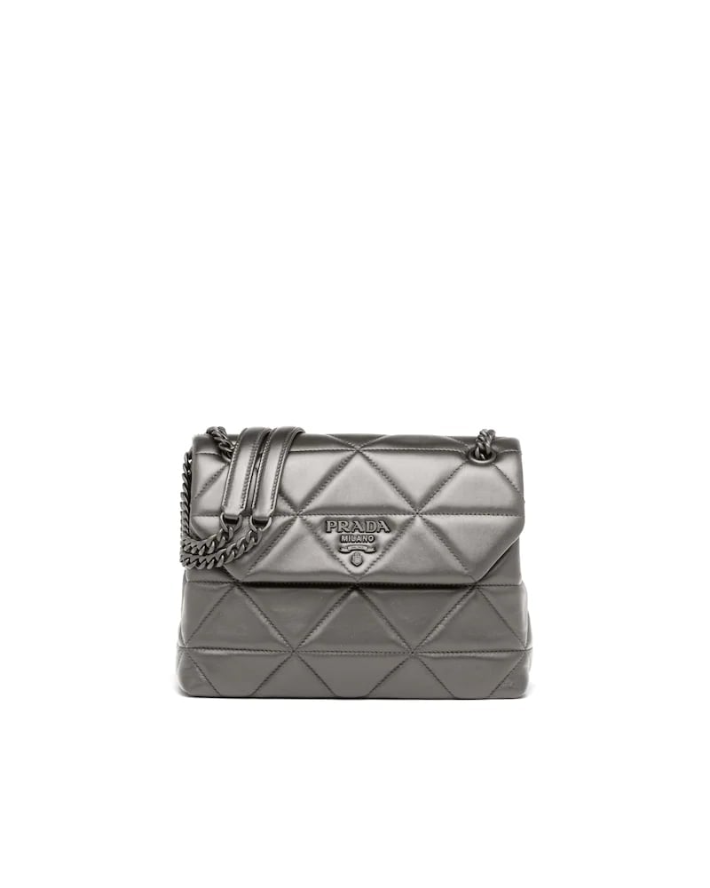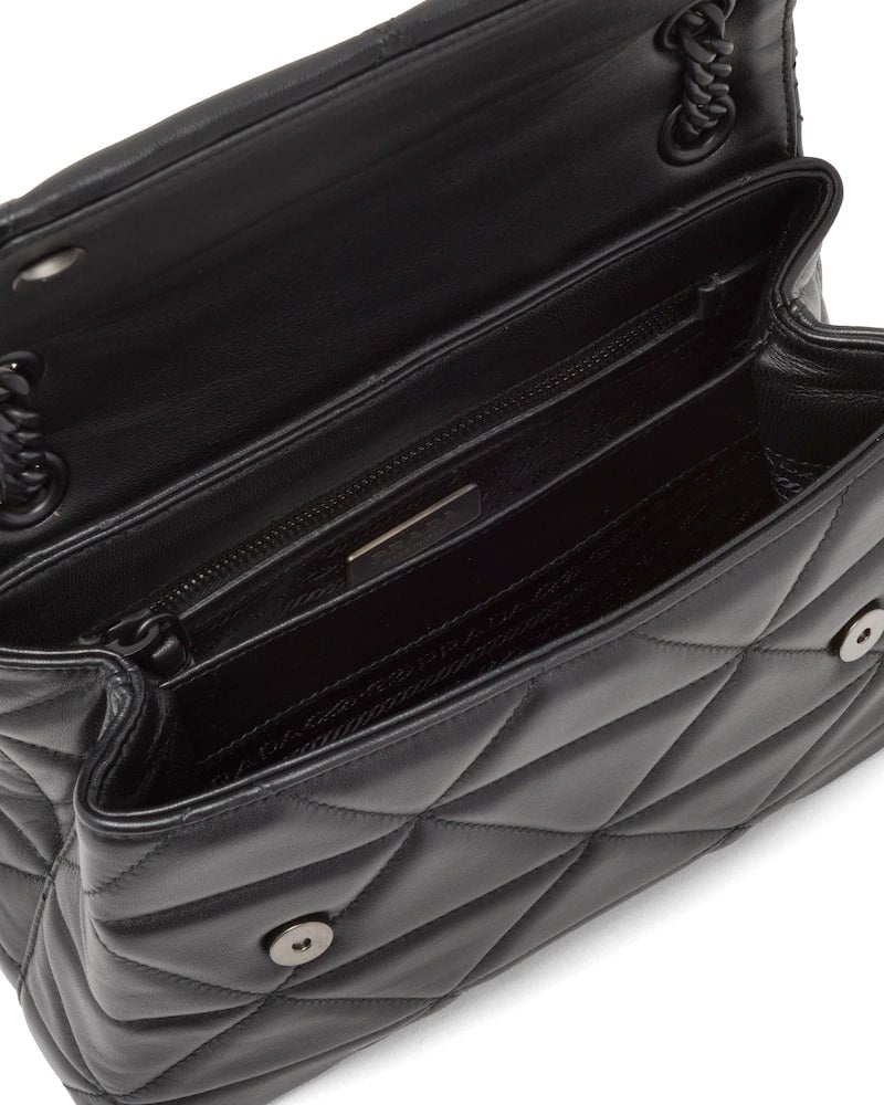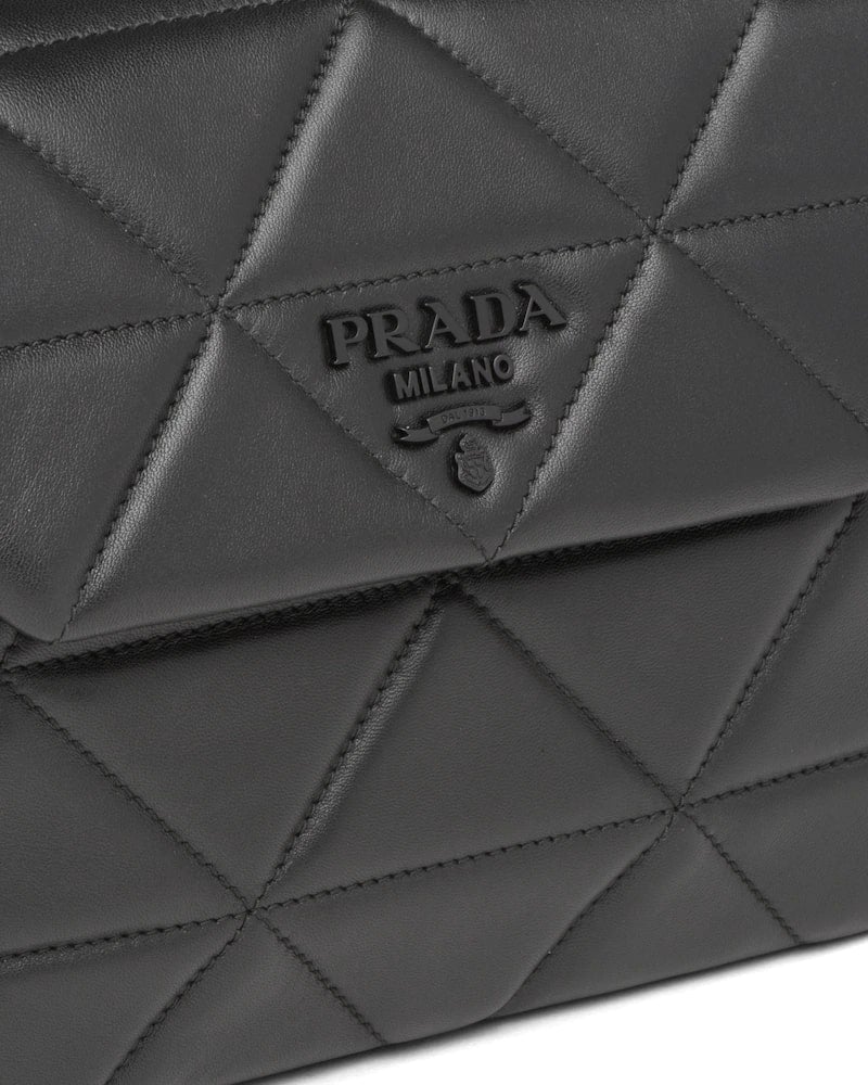 The Prada Spectrum bag is characterized by a geometric motif designed by the stitching on the nappa leather. It has a tonal metal lettering logo.