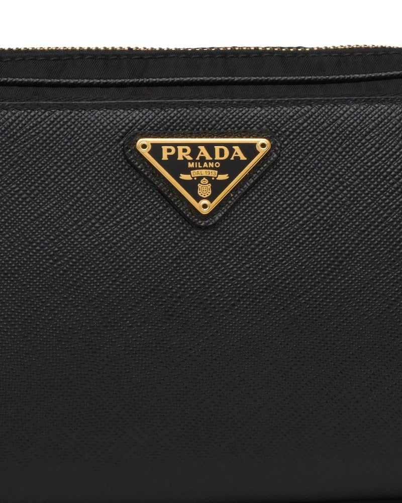 This compact bag is made of nylon and Saffiano leather. This accessory has a detachable adjustable shoulder strap.