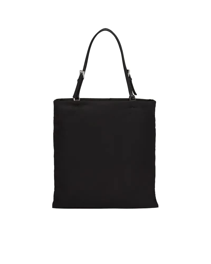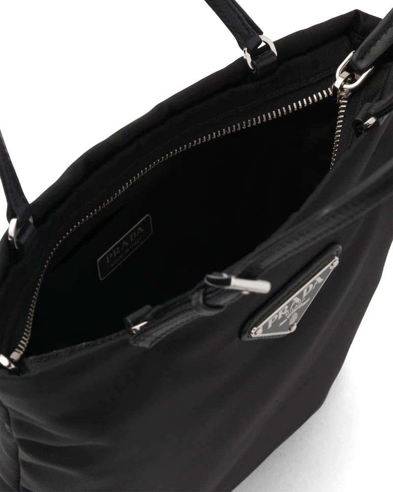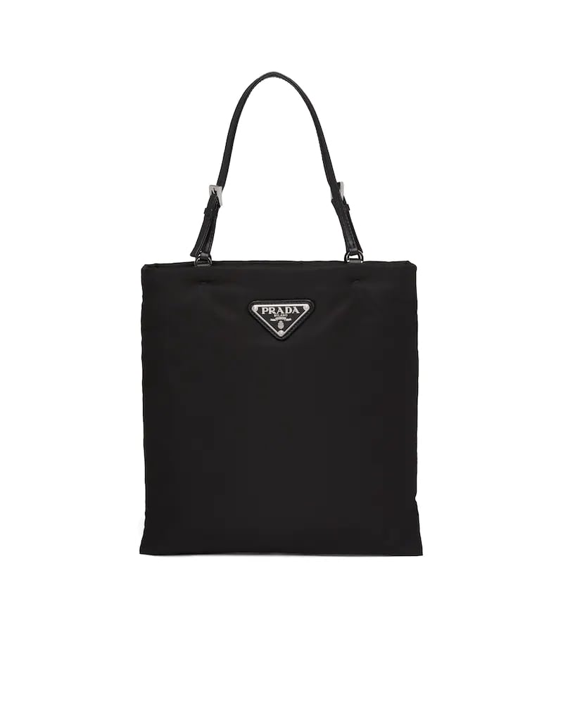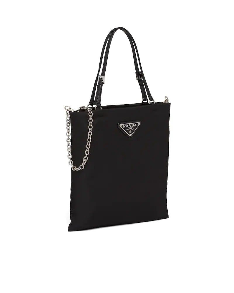 This modern, minimalist handbag in nylon, a distinctive material of the brand, is decorated with sophisticated details like the chain shoulder strap and the metal triangle logo.