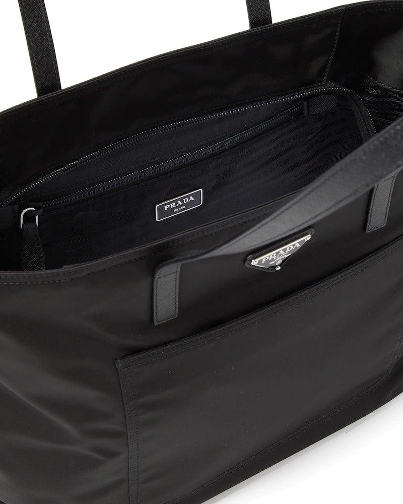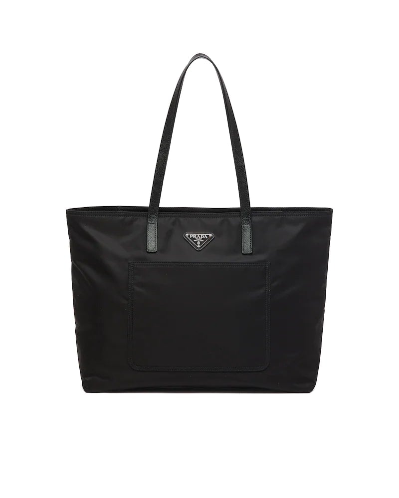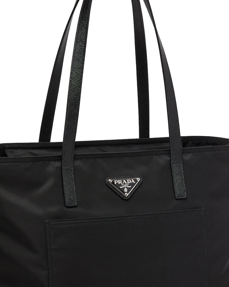 A large front pocket stands out on this classic tote bag made of nylon, embellished with Saffiano leather handles and decorated with the distinctive triangle logo. First introduced to the luxury world by Prada, nylon exemplifies the brand's propensity to combine concepts, techniques and shapes that were previously considered irreconcilable. Contradiction is woven into the fabric of the brand.