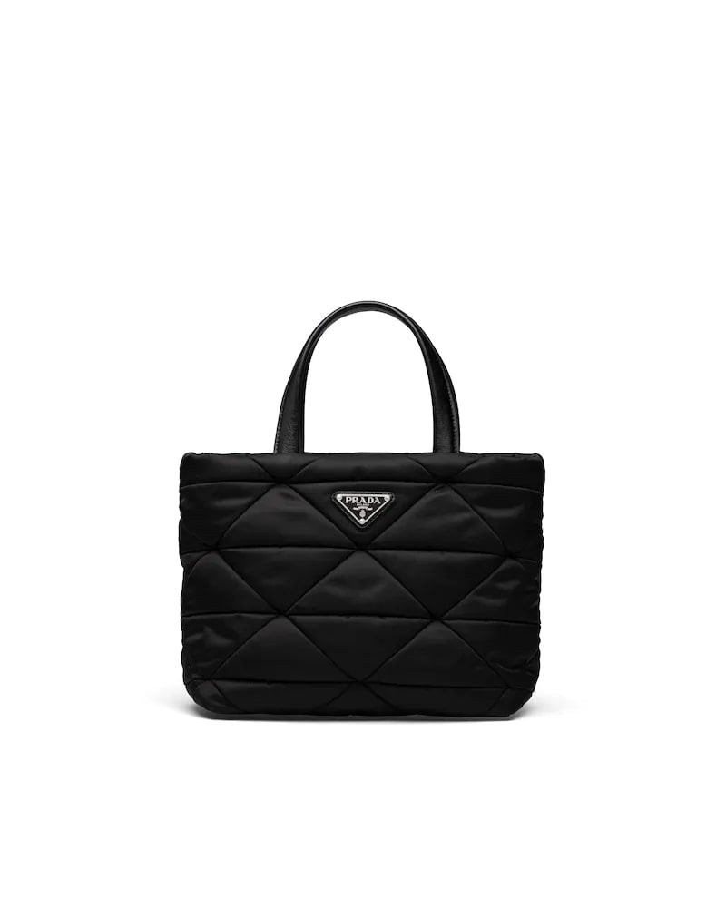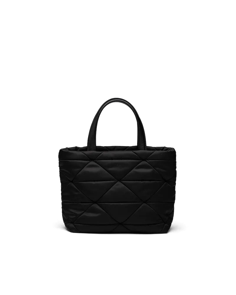 Triangle-shaped patchwork stitching characterizes this padded nylon tote. Accented with nappa leather handles and a detachable woven nylon shoulder strap, the bag is decorated with the iconic enameled metal triangle logo.