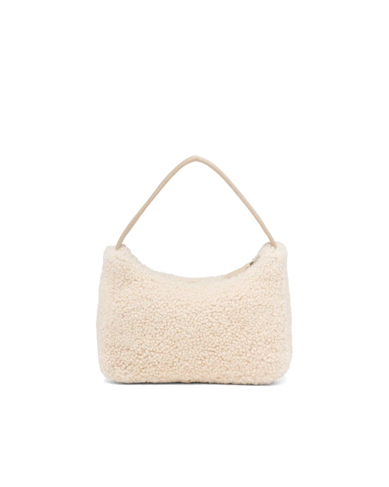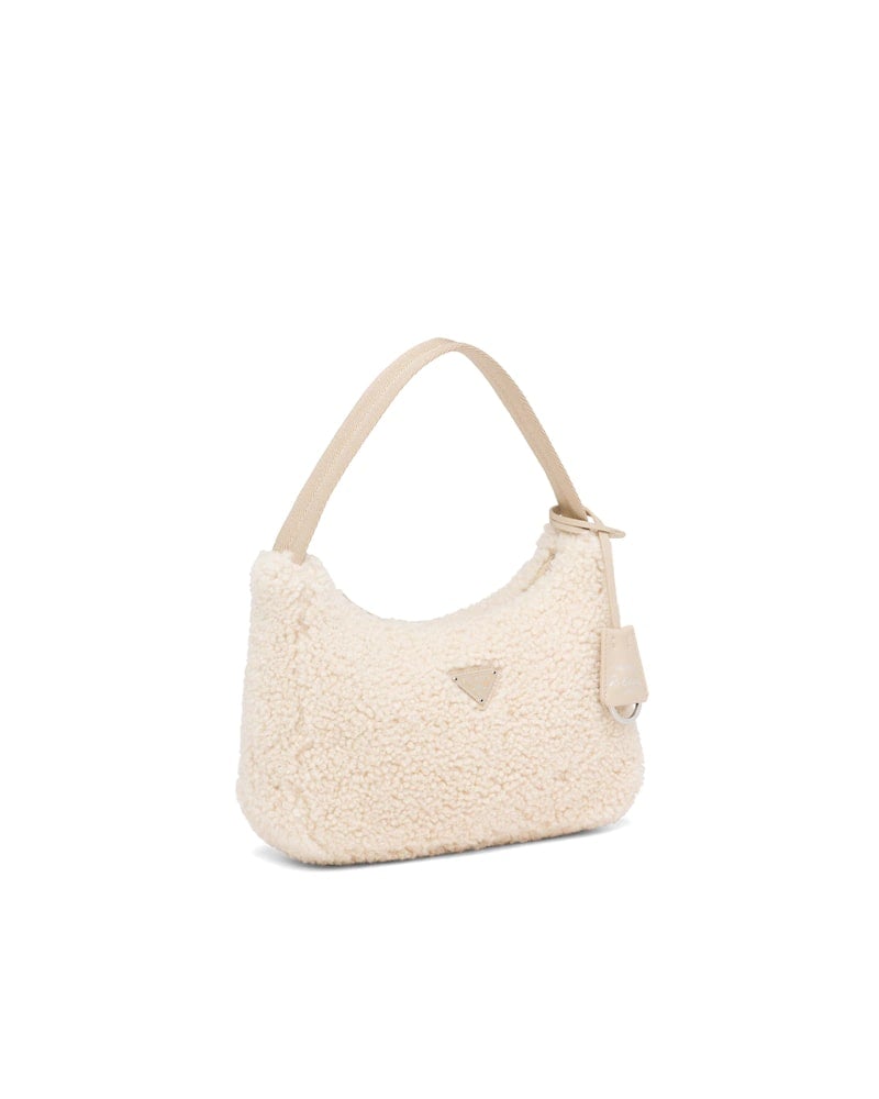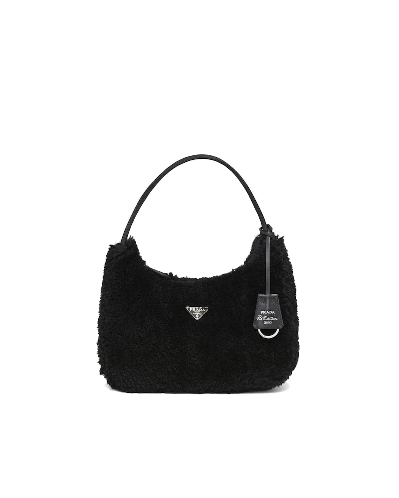 The Re-Edition 2000 mini-bag made of shearling is a new interpretation of an iconic Prada style. The accessory with zipper closure and woven nylon handle is decorated with the iconic enameled metal triangle logo.