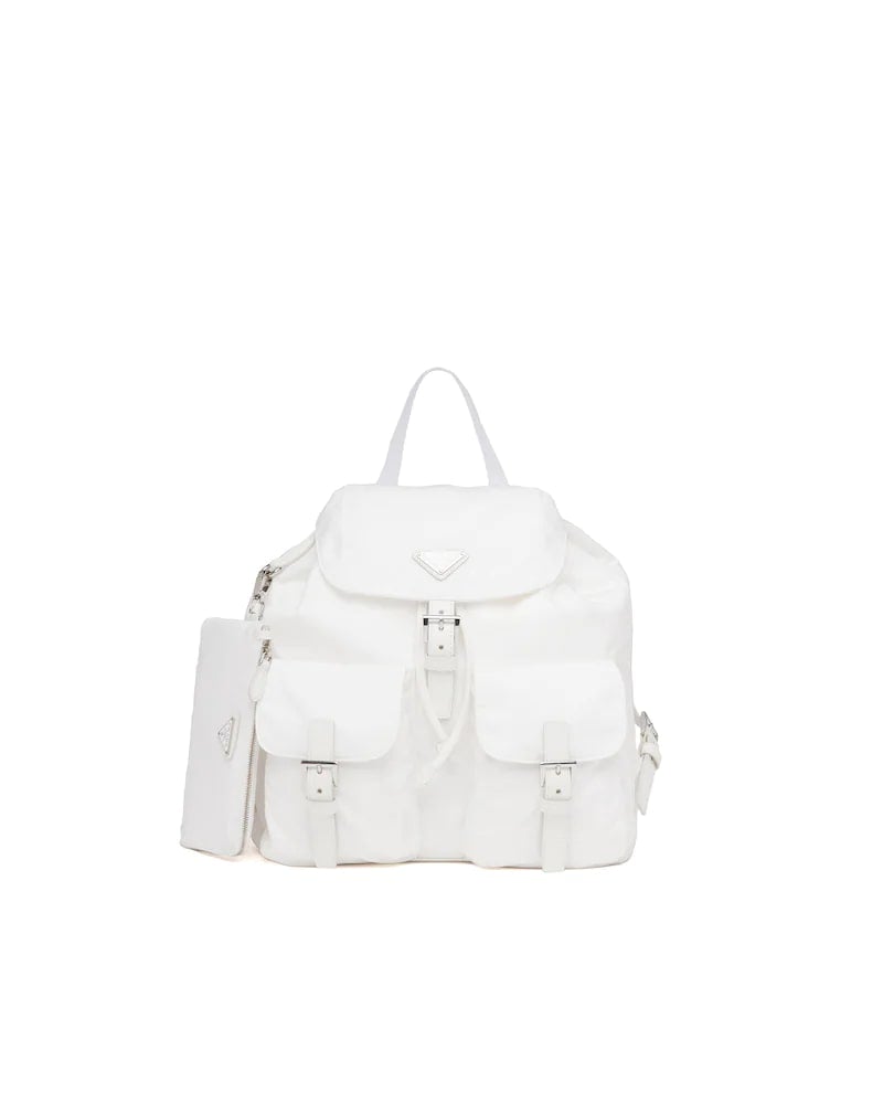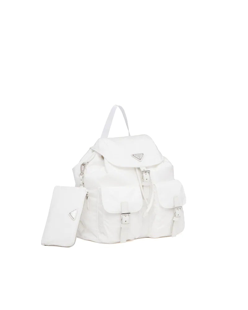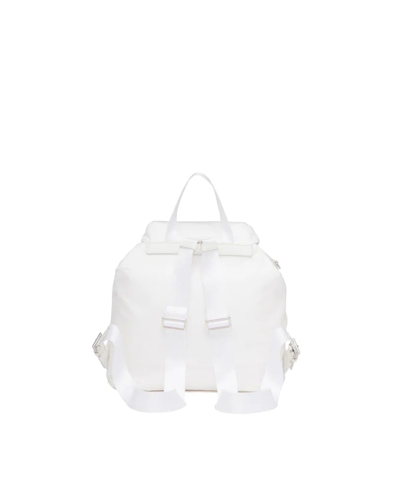 A blend of materials with modern allure and timeless charm are the choice for this iconic backpack of the brand that combines a base made of Re-Nylon, a sustainable evolution of the industrial fabric that is a Prada hallmark, and Saffiano leather details. The enameled metal triangle logo, an historic element reinterpreted each season on designs with contemporary charm, decorates the front.