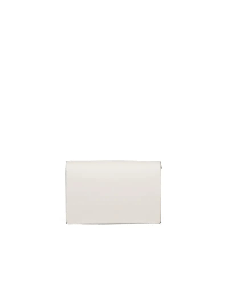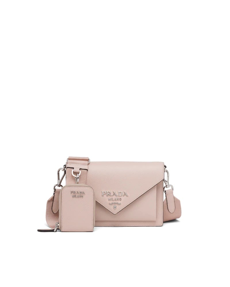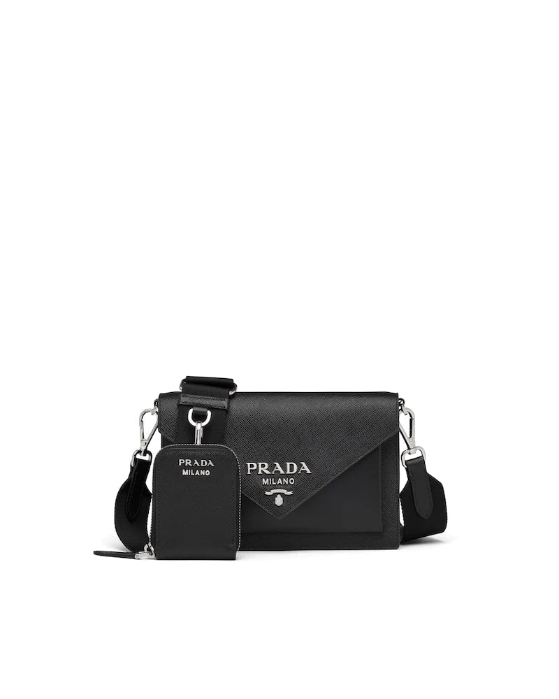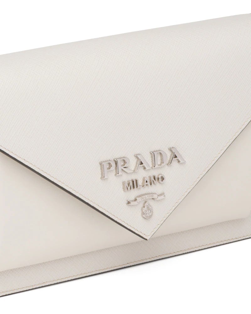 The emblematic Prada lettering logo decorates the front of this mini envelope bag with front flap. The accessory with magnet closure has a shoulder strap that lets it be worn as a crossbody or shoulder bag. The nappa lining has a small pocket with removable mirror.
