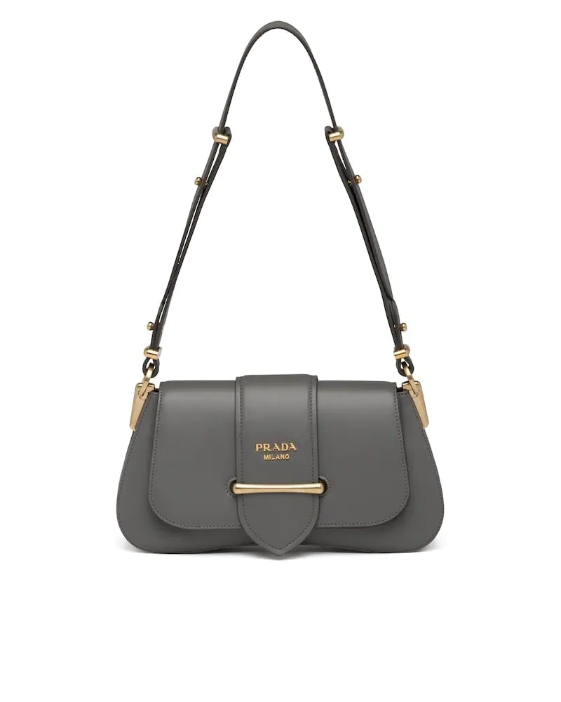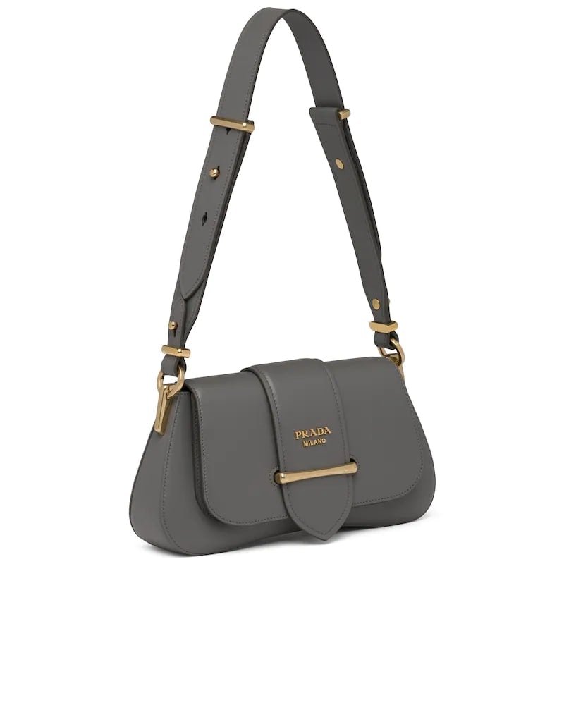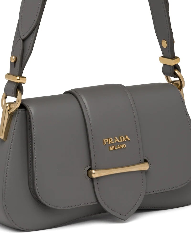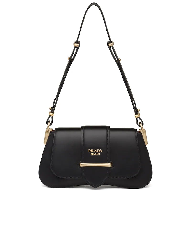 A sinuous line traces the silhouette of the Prada Sidonie bag, one of the brand's iconic styles. The design with contoured flap and strap closure is made of leather and embellished with metal hardware and Prada's emblematic lettering logo.
