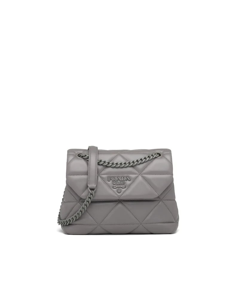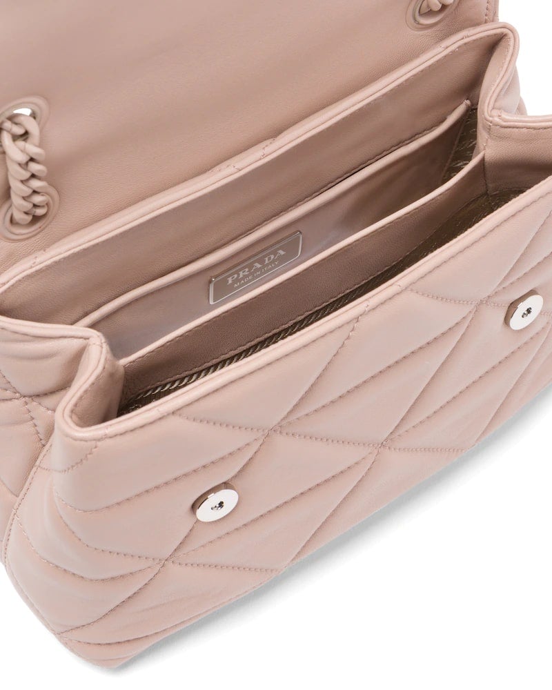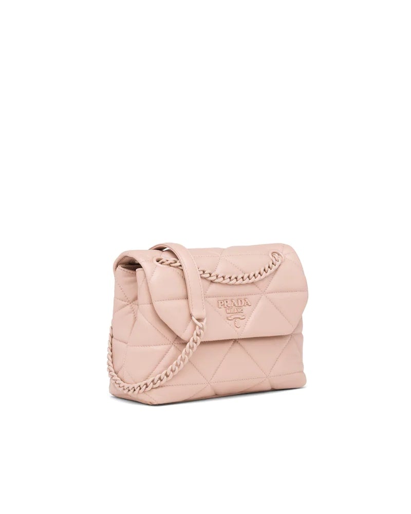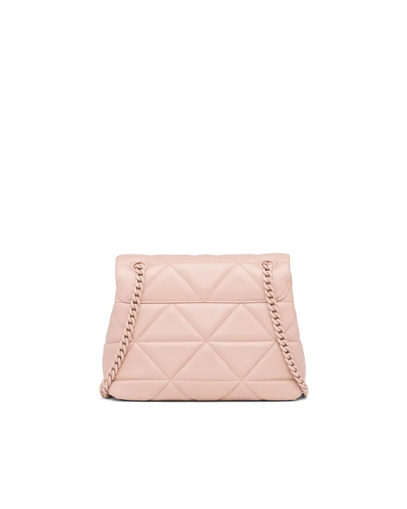 Feminine in design, the Prada Spectrum bag is made of nappa leather with a stitched motif. It has a tonal chain shoulder strap.