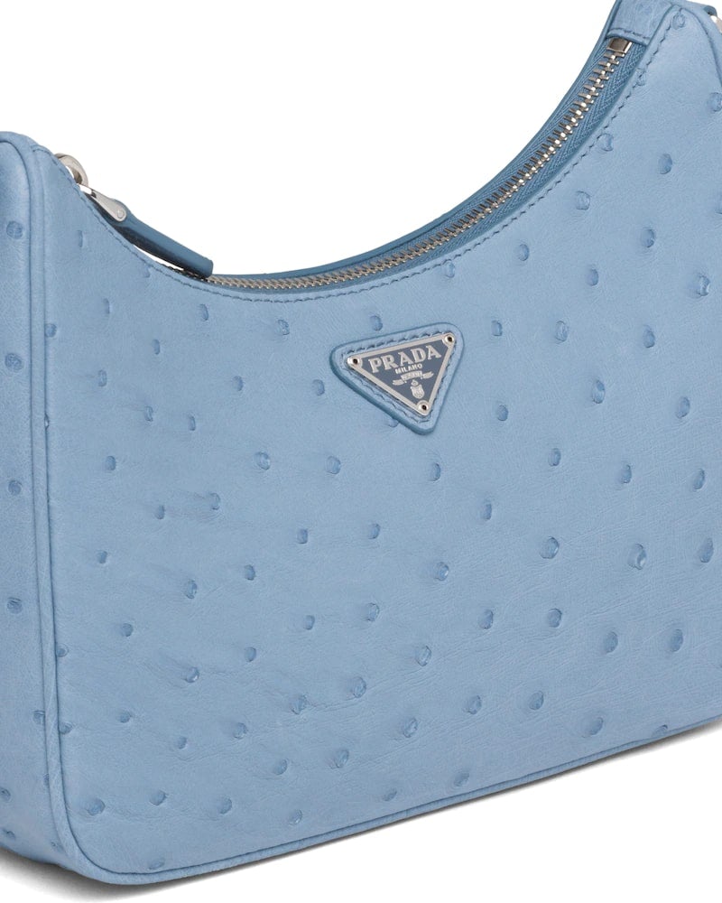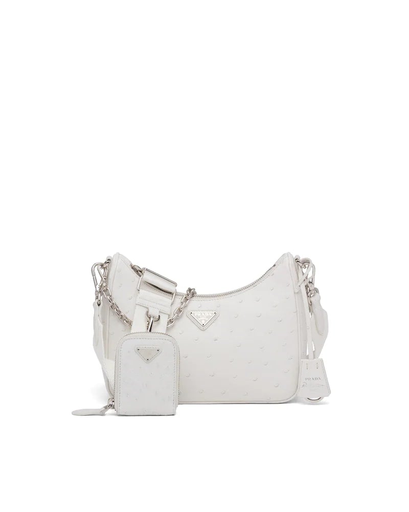 An iconic silhouette with sophisticated details that enhance the design: Prada plays with the classic shoulder bag, presenting the 2005 Re-Edition in ostrich leather. The accessory comes with a removable pouch and keychain that makes it unique and functional.