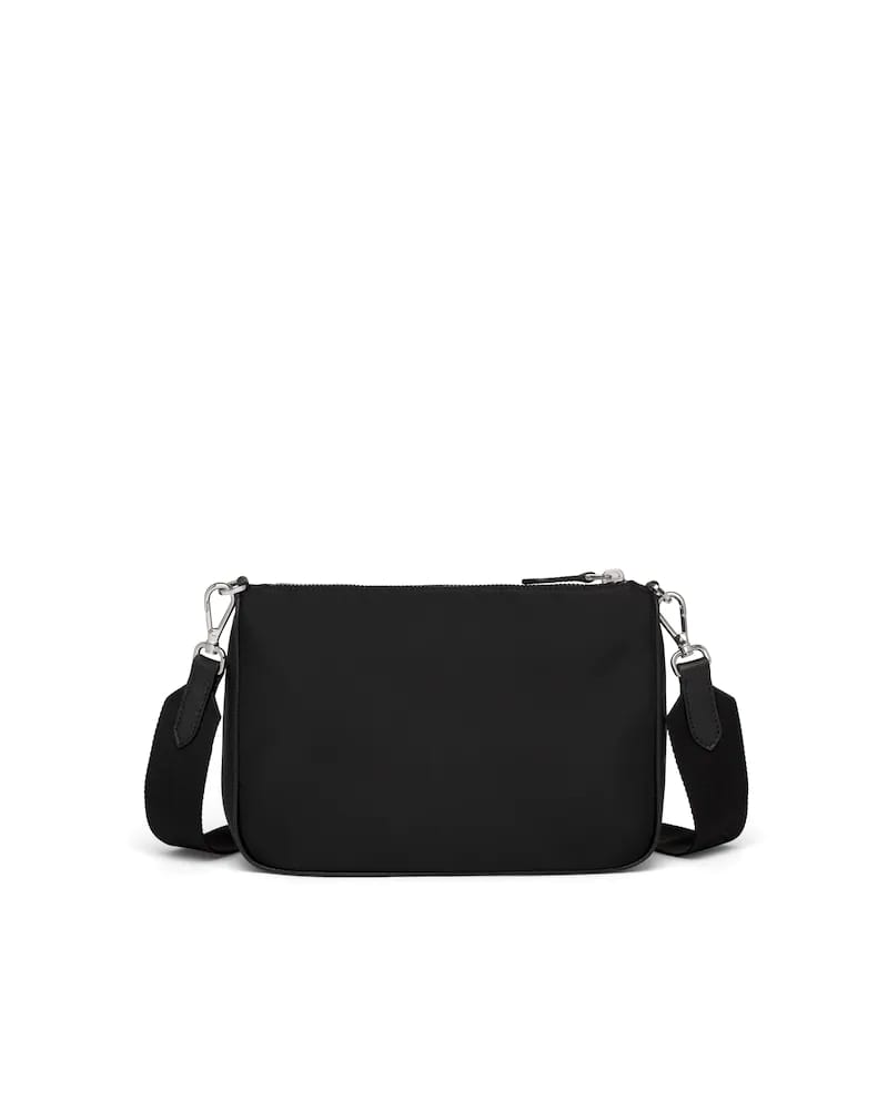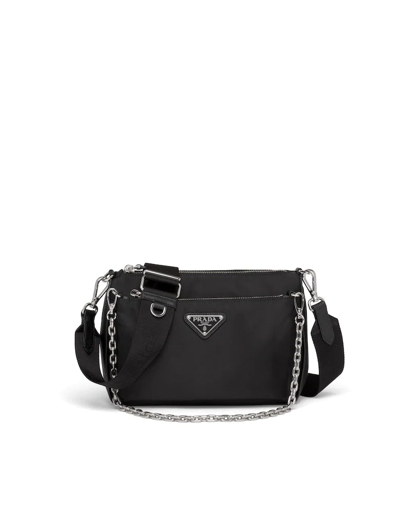 Saffiano leather details add an iconic touch to this shoulder bag made of Re-Nylon, a signature fabric of the brand produced from recycled, purified plastic trash collected in the ocean, fishing nets and textile waste fibers. It has distinctive removable details: the logo-print woven nylon shoulder strap and the front pocket with chain that turns into a pouch. The accessory is embellished with the enameled metal triangle logo.