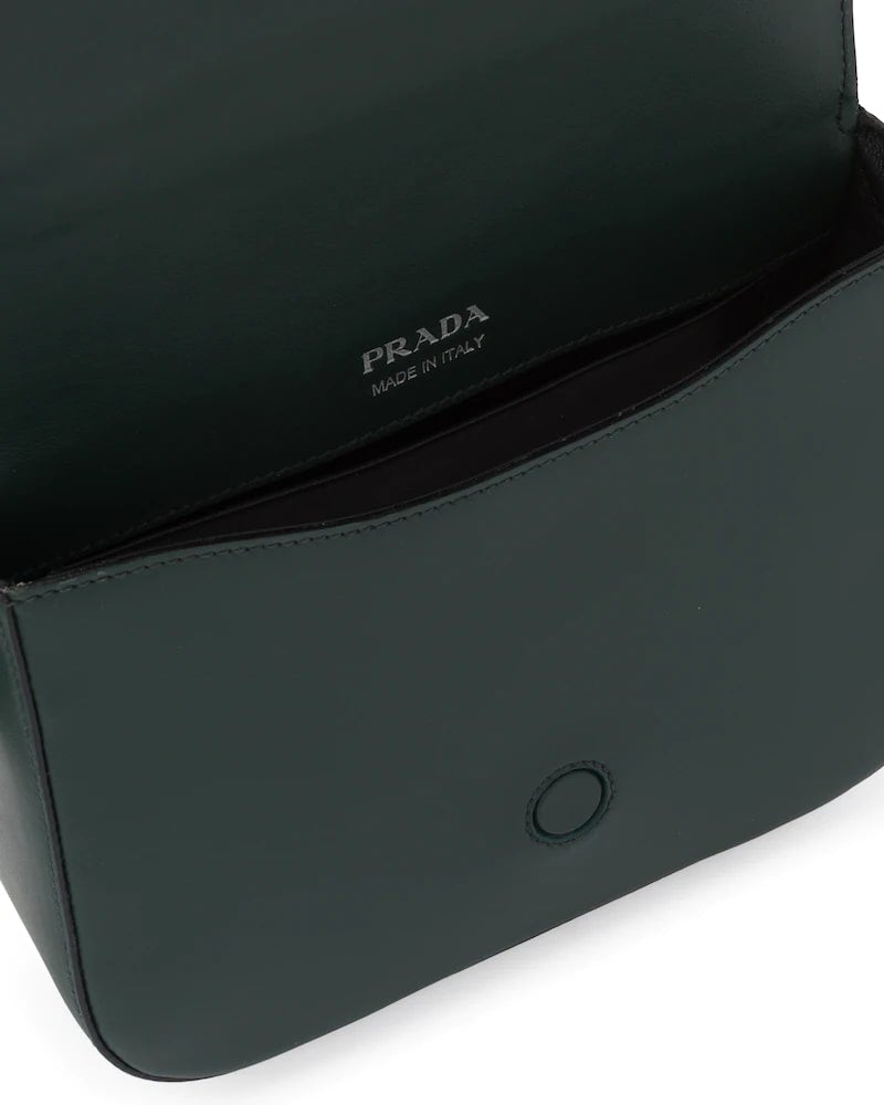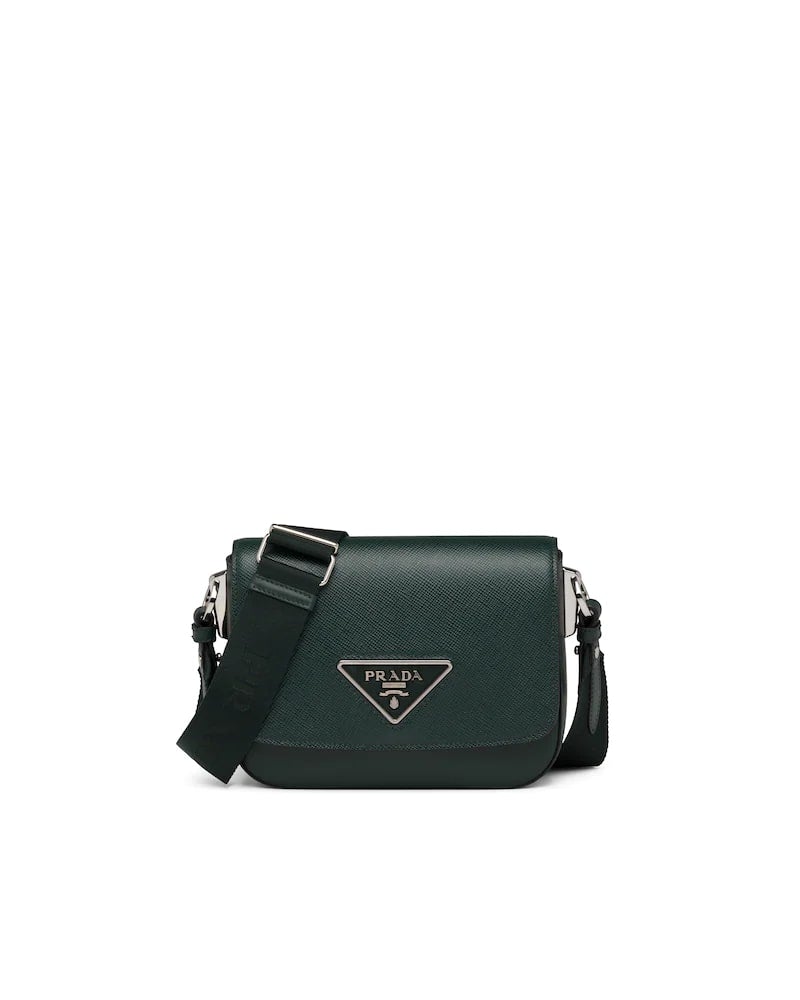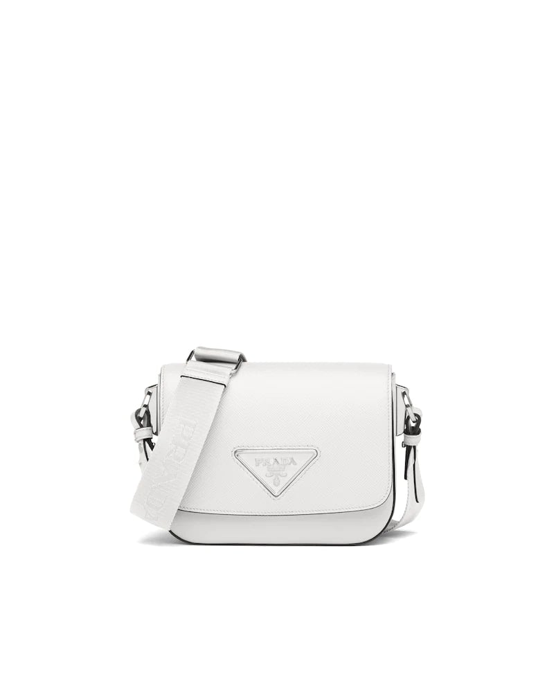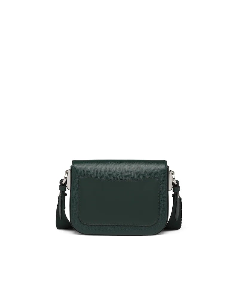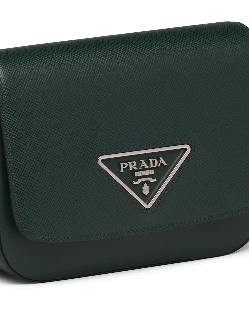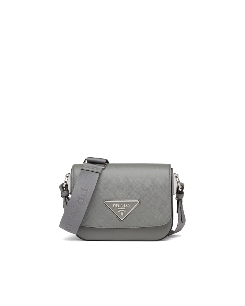 The Prada Identity bag, a sleek, modern design full of sophisticated allure, is made of Saffiano leather, the iconic material of the brand defined by a crosshatch effect with a waxed finish. Smooth leather trim completes the flap featuring the lettering logo framed by the emblematic metal triangle.