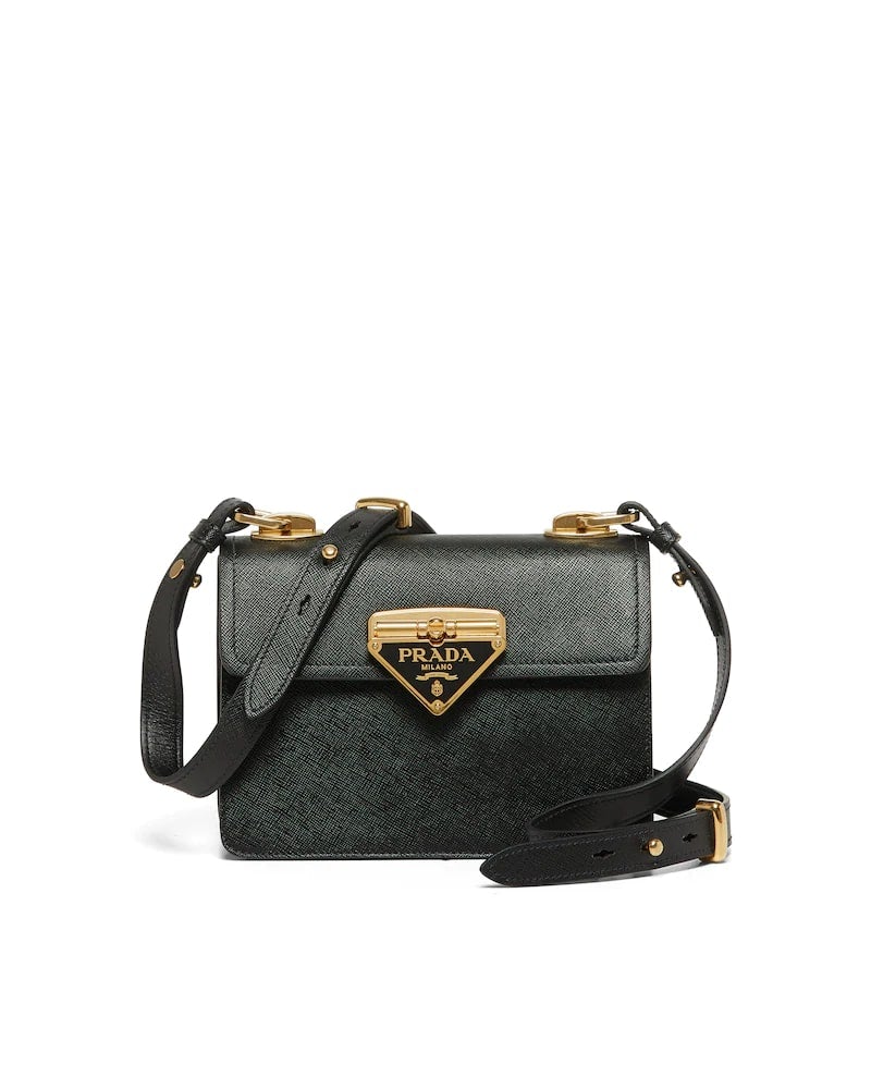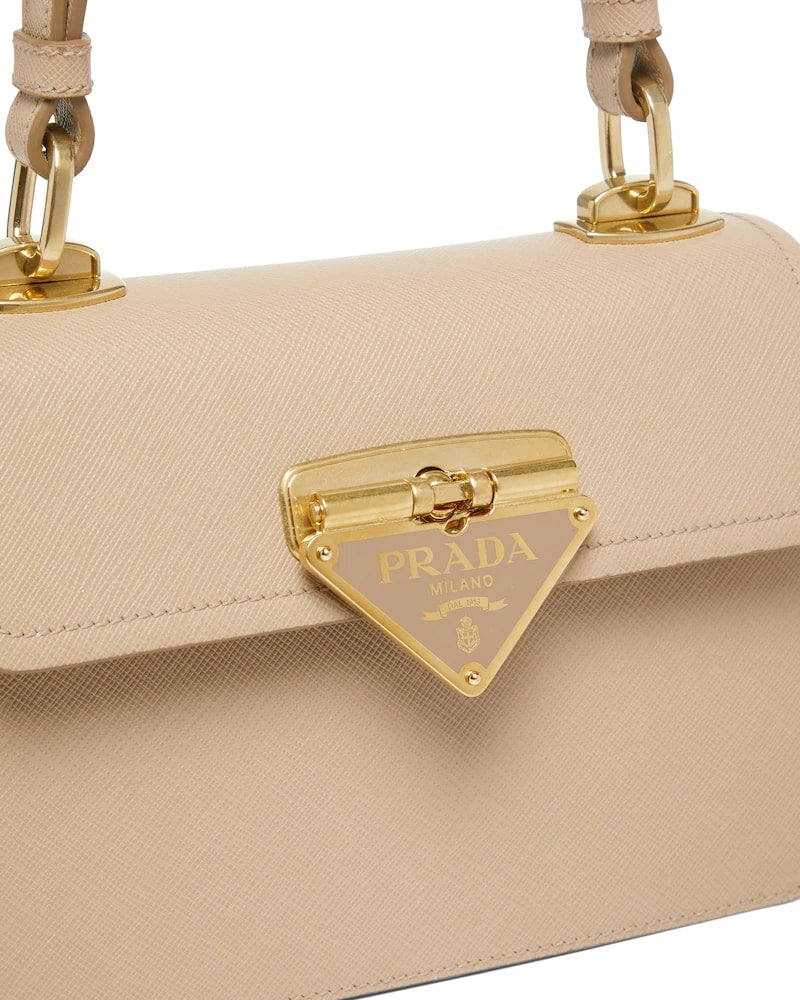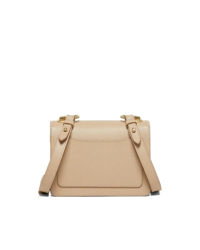 This sleek shoulder bag made of Saffiano leather features a new clasp with the iconic triangle logo. Feminine yet functional, the accessory stands out for its metal hardware reminiscent of the type used on luggage.
